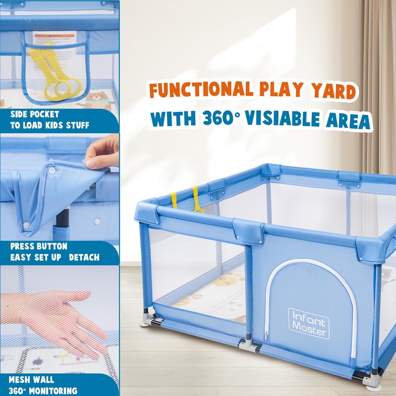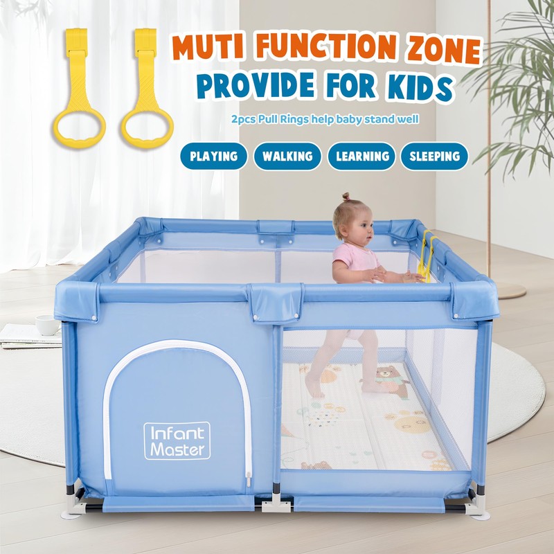 Infant Master Baby Playpen, 49''x49'' Playpen for Baby & Toddler, with Portable Mat & Hand Pulling Ring, External Zipper Entrance Safe for Baby, Blue(QL-PL-B120)