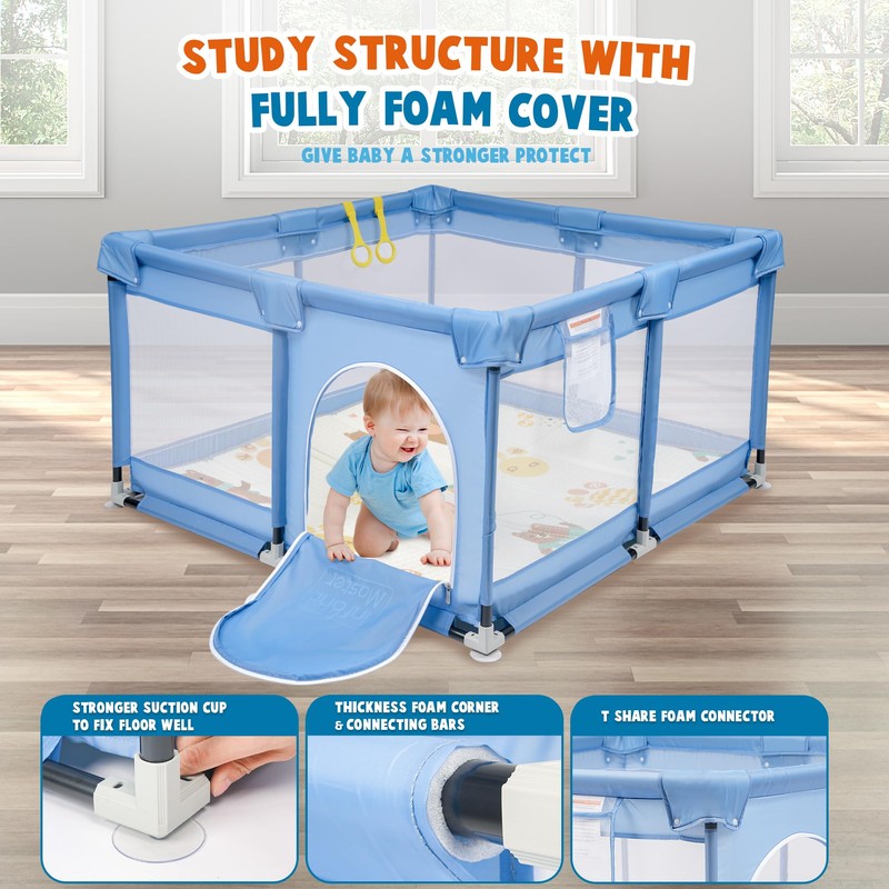 - Give Baby A Stronger Protect with Fully Foam Cover - With externalthe zipper door design makes it easy to get in and out of the playpen, and the soft foam cover and connecting bars support kids walk or play safer. The added side pocket enable to load kids stuff and have anytime.