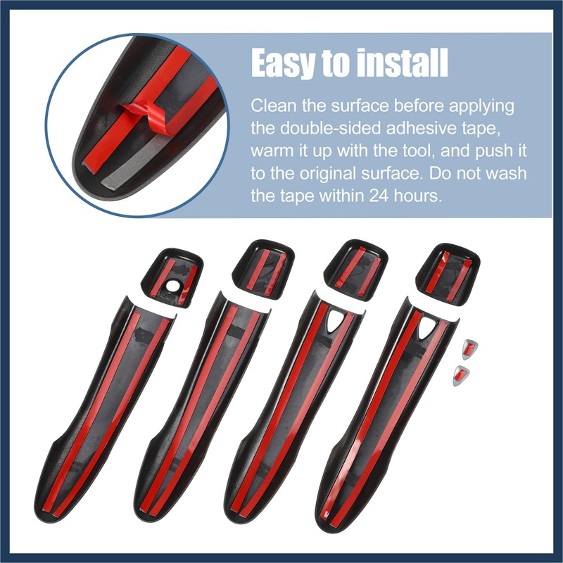 • Simple: Installation: Please clean the area and remove any materials before installing these door handle covers and mirror cap covers. To correctly install the product on the vehicle, check the installation area with the product against the car and then remove the backing from the double-sided tape. Please avoid washing your car or touching the water after installation within 24 hours.