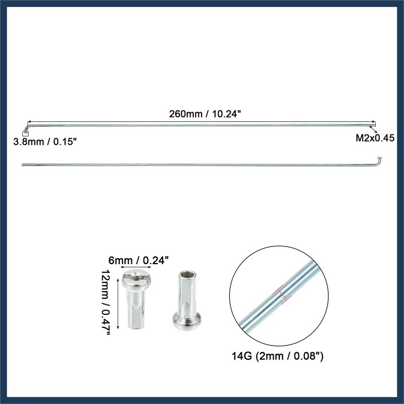 - Beneficial: Nipples Size: 12x6mm / 0.47"x0.24"(H*D), Spoke Shaft Diameter: 14G (2mm / 0.08"), Elbow Head Diameter: 3.8mm / 0.15", Spoke Length(without Elbow): 260mm / 10.24", Spoke Thread Diameter: M2x0.45, Spoke Structure: J Bend/Cylinder