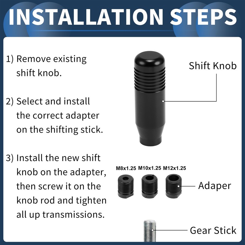 - 取り付け手順: 1. 既存のギアシフトヘッドを取り外す; 2. 正しいアダプター(M8/M10/M12)を選択して取り付ける; 3. 新しいギアノブをアダプターに取り付ける; 4. シフトノブロッドを直接挿入し、締めて取り付けを完了する。