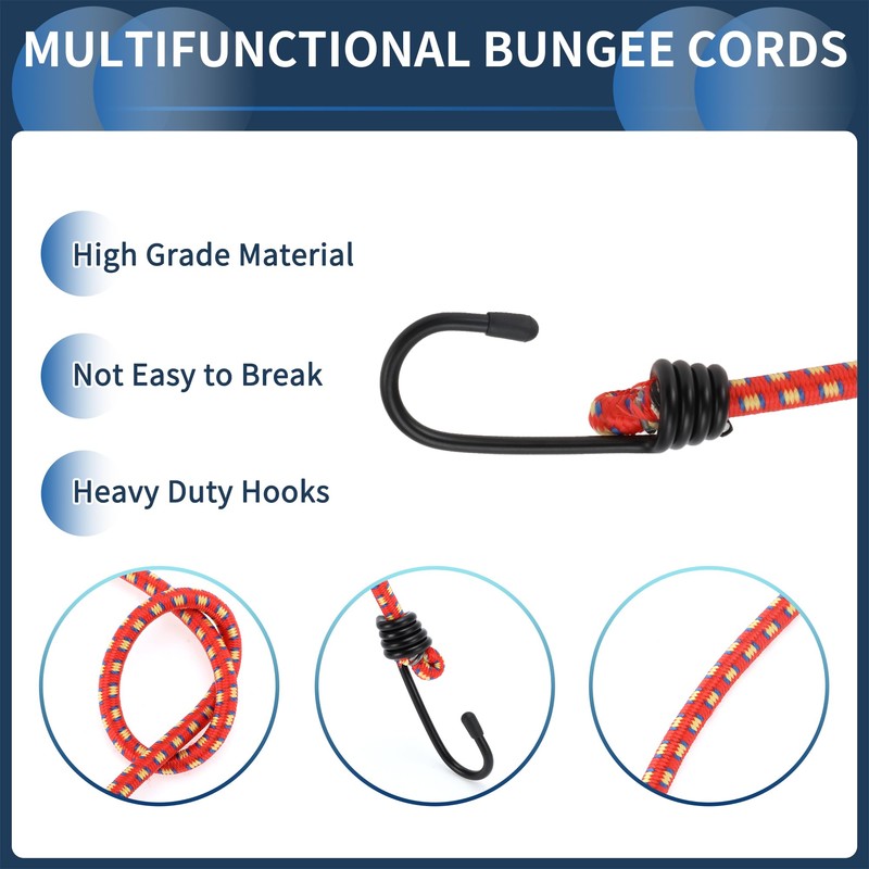 - Universal Fit: These adjustable bungee cords, featuring hooks, are versatile and widely applied in diverse indoor and outdoor environments. Beyond their evident use in attaching heavy items like those on a car's roof or a truck's bed, they effectively secure luggage, tools, and other belongings in position. They stand out for their good length and width compared to standard bungee cords, providing enhanced utility across a range of applications.
