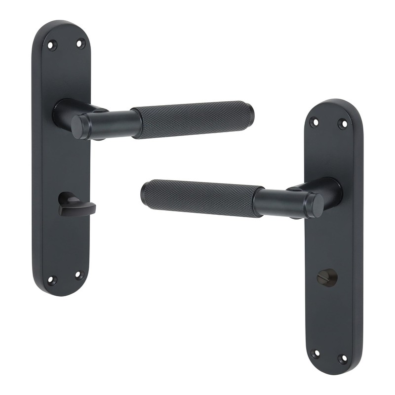 Infinity Decor Set of Matt Black Knurled Privacy Lever Door Handle on Shaped Backplate Bathroom Latch Lever Handle for Internal & External Use