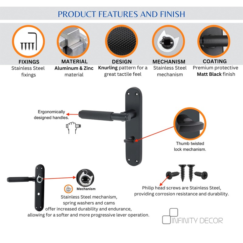 - ✅Description: Our matt black knurled lever door handles with thumb turn on a shaped backplate, featuring a timeless classic modern design comfortable square head backplate straight lever for interior doors. They are similar to a bathroom door handle thumb turn lock inside and emergency coin release on the outside of the door.