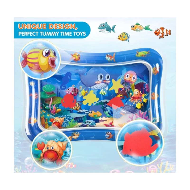 - Promote your baby's sensory development: The soft, comfortable baby tummy time water mat is the perfect sensory toy for developing solid head, neck and shoulder muscles as well as refining the hand-eye coordination, fine motor and social skills. The bright, colourful sea animals and eye-catching illustrations will keep your baby playing for hours.