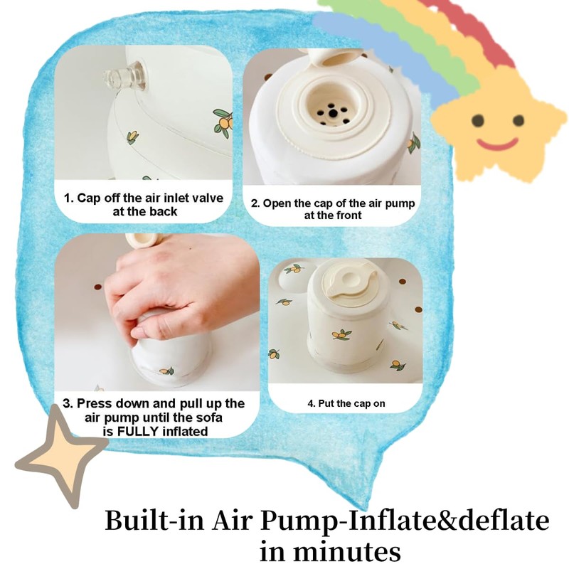 - Easy to use: simply press the built-in air pump up and down to inflate the chair easily without other tools. It is small and easy to carry when folded, so your baby can sit anytime and anywhere.