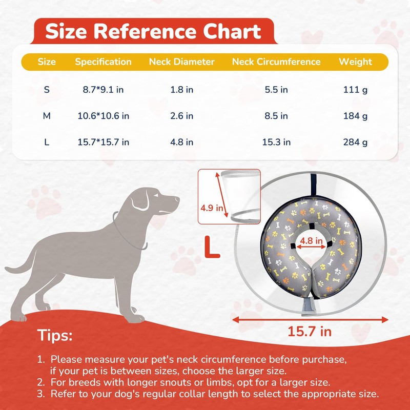 - 🐾 CHOOSING THE RIGHT SIZE FOR YOUR PET: This soft cone comes in 3 sizes (S/ M/ L), providing a wide range of options for pets of different sizes and breeds. It is suitable for all kinds of small, medium, and large dogs. When choosing the size, not only the dog's neck circumference should be considered, but also the width of the cone and the height of the shield to ensure complete coverage of the wound.