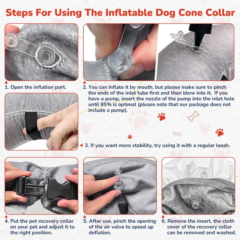 - 🐾 TIPS: 1.As it is an inflatable collar, it is not possible to keep it fully inflated all the time, so please check the inflation and the damage of the product regularly; 2.improper fit or persistent behaviour can also cause the dog to lick its own wounds, please pay close attention to your dog's behaviour to minimise the risk.