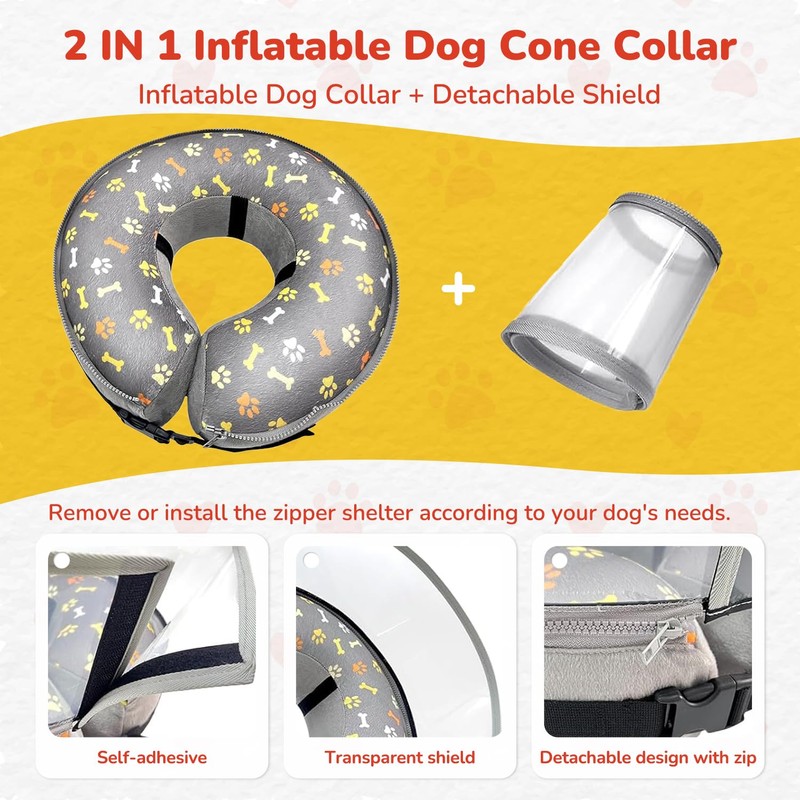 - 🐾 DOG CONE ALTERNATIVE: Compared to traditional inflatable collars or plastic cone collars, this 2-in-1 inflatable dog cone collar has an upgraded shielded inflatable collar that is not only comfortable to wear, but also has a shielded design that creates a barrier to prevent your pet from licking, biting, or scratching the wound or surgical site without blocking your dog's view and minimising discomfort. The clear cover comes with a removable zip that allows you to attach and detach the clear shield as needed. Available as either a basic collar or an enhanced protective collar.