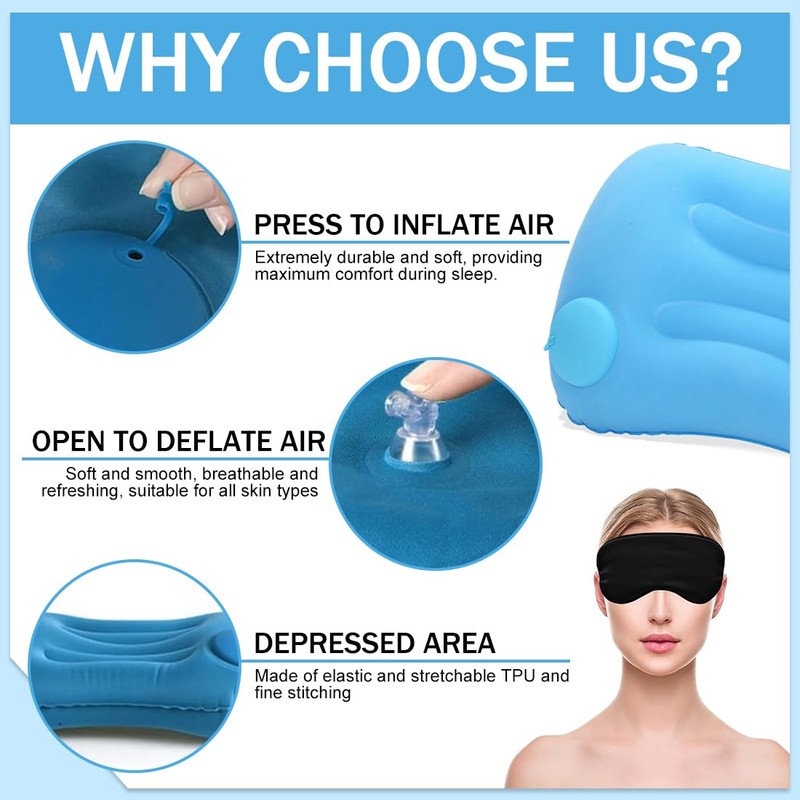- Inflatable Pillow: Our inflatable pillow is not only suitable for travel, hiking, beach and camping, but also can provide additional lumbar support at home and office; In addition, our sleep mask has an adjustable elastic band that does not move or slip during sleep and adapts to different head circumferences. Create the most comfortable sleeping position without your hair getting tangled.