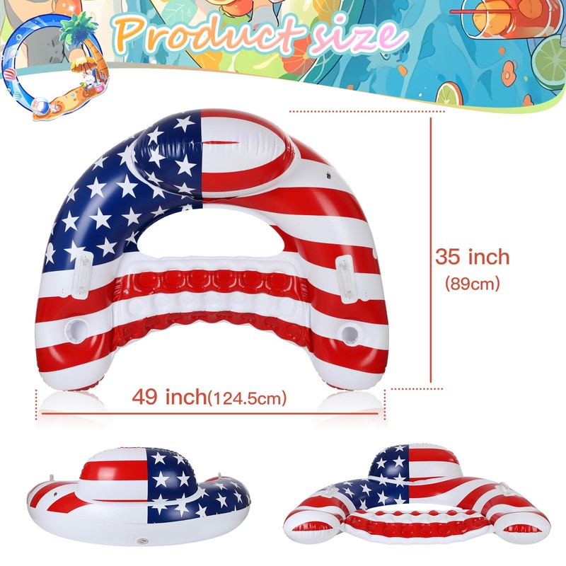 The soft bottom and backrest delivers soothing comfort and lets you cool off. And pool sofa float with 2 cup holders and 2 handles, you can always have your beverages as you enjoy pool time on the pool floaties. The L x W of the floating pool lounge chairs are 35in x49 in, which is very suitable for adults. It inflates and deflates quickly. Easy to storage and carry, perfect for travel!