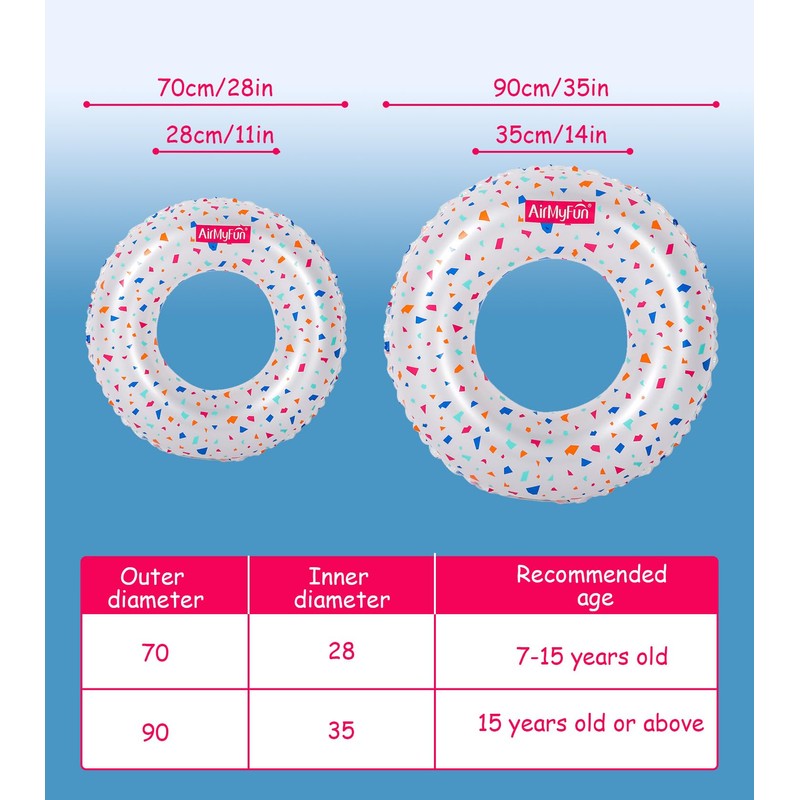 - Suitable for children and adults: two sizes swim ring to choose from. The outer diameter is 70 cm or 90 cm, swimming hoop adults and children. Swimming ring for children and adults suitable for swimming, pool parties or other water activities.