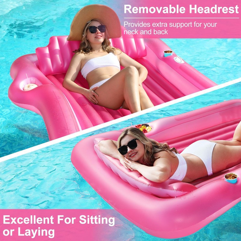 - Comfortable Pink Tanning Pool: Includes one 71”x47”extra large inflatable suntan pool lounger featuring an inflatable base for extra comfort, 1 drink holder, 1 Cooler Tray, a removable headrest and a hose cover; The carry handle makes it easy to use