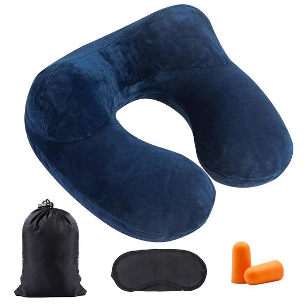 Inflatable Travel Pillow, Neck Pillow, Soft Velvet Neck Support, Neck Pillow, Ideal for Travel, with Compact Carry Bag, Earplugs, Eye Mask, for Travel, Planes, Trains and Offices, Navy Blue
