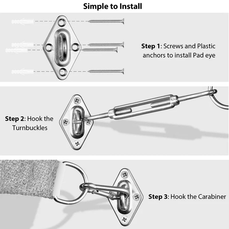 - High-quality Stainless Steel Material: The shade hardware kits made of premium stainless steel material, durable, strong, and rust-proof, able to withstand harsh weather. Using this specialized sunshade sail kits outdoors can make shade sails, canopies and shade cloth is installed more firmly.