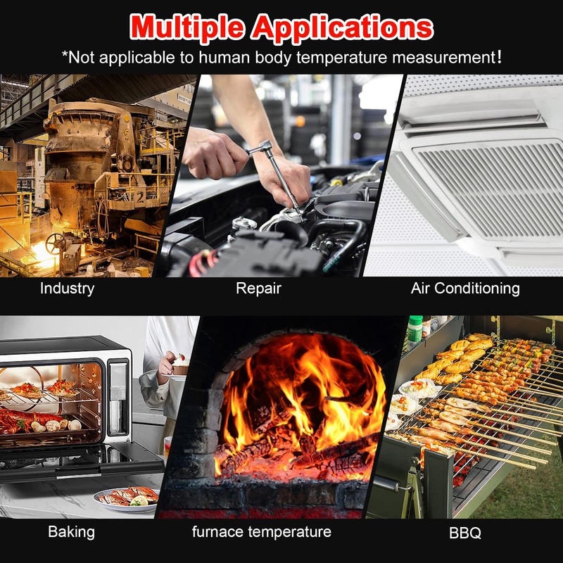 - Wide application: the infrared thermometer is convenient to use, suitable for HVAC electromechanical industrial applications, predictive maintenance, dangerous places and processes, high-end broilers, ovens, ovens, forging, metal casting, melting professional high temperature testing, aluminium alloys, ceramics, etc. For comments or suggestions, please do not hesitate to contact us and we will reply within 24 hours.