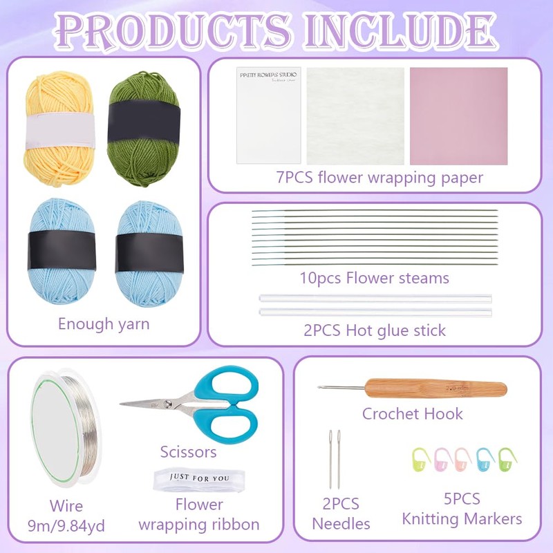 - COMPLETE CROCHET FLOWER KITS:This flower crochet kit includes a complete set of accessories required for weaving, including 2.5mm crochet hook, 4 strands of milk cotton, 30cm flower stem, fine iron wire, 5 marked clasps, 2 needles, , 2 glue sticks, floral packaging paper, and detailed instruction video tutorials. Beautiful and adorable unique design meets your DIY weaving needs, with complete tools and materials to create your own cute bouquet.