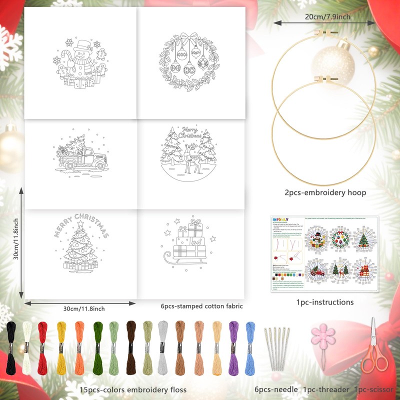 - EMBROIDERY STARTER KITS: These DIY embroidery kits will meet all your needs. Includes 6 kinds of Christmas-themed pattern fabrics (11.6 x 11.6 inches) such as Christmas tree, light ball, gift, elk, snowman, gingerbread man, car, garland, snowflake, 2 embroidery hoops (diameter: 7.8 inches), enough colourful embroidery threads, 6 embroidery needles, a pair of scissors, a threader, an OPP bag and an easy-to-follow instruction