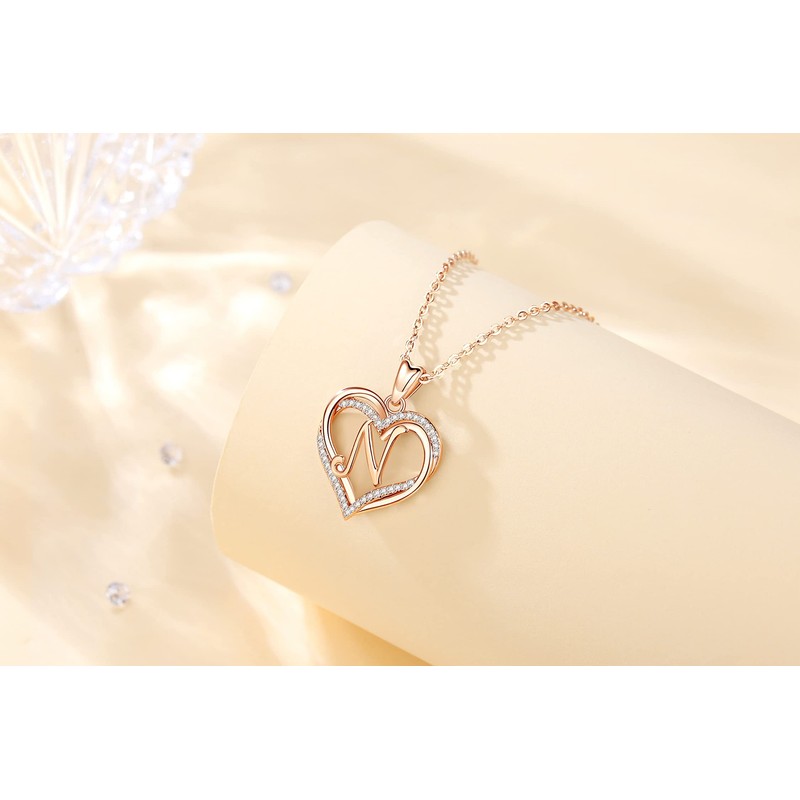 INFUSEU Name Necklace, Double Heart Rose Gold N Letter Jewellery Alphabet Pendant Cubic Zirconia CZ Romantic Gifts For Women Girlfriend Girls