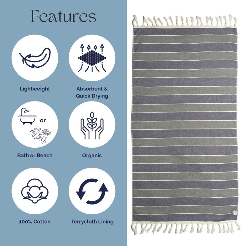 InfuseZen Terry Cloth Lined Turkish Bath & Beach Towel – Striped Design - 100% Organic Turkish Cotton - Soft, Lightweight, Absorbent Peshtemal, Quick Dry for Beach, Bath, Throw, Travel - Navy/Gray