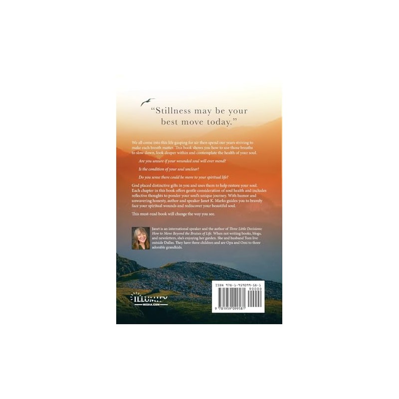 We all come into this life gasping for air then spend our years striving to make each breath matter. This book shows you how to use those breaths to slow down, look deeper within and contemplate the health of your soul.Are you unsure if your wounded soul will ever mend? Is the condition of your soul unclear?Do you sense there could be more to your spiritual life?God placed distinctive gifts in you and uses them to help restore your soul. Each chapter in this book offers gentle consideration of soul health and includes reflective thoughts to ponder your soul's unique journey. With humor and unwavering honesty, author and speaker Janet K. Marks guides you to bravely face your spiritual wounds and rediscover your beautiful soul.This must-read book will change the way you see.