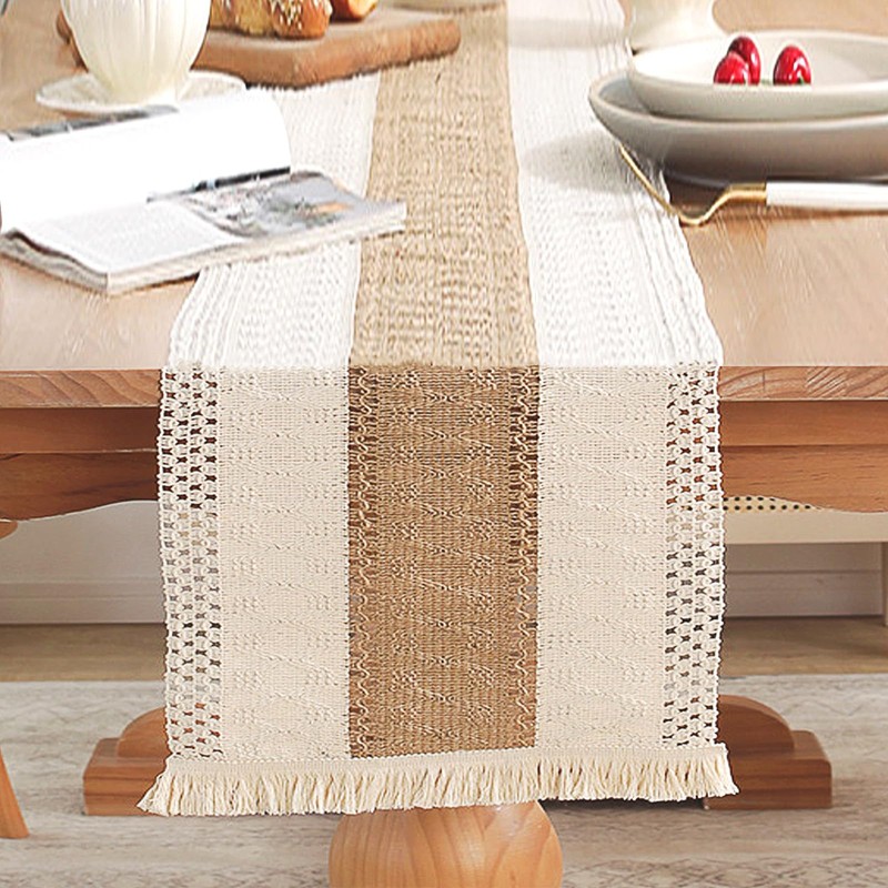 - Splicing design: table runner with tassel, hollow detail, rustic beige and brown colour match. These details make the table runner show bohemian and vintage style. (Machine washable, tumble dry low, do not bleach and do not put in a hot dryer.)