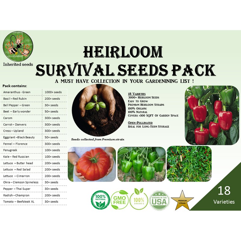 Inherited Seeds HEIRLOOM Survival Kit 3000+ seeds 18 Varieties Pack PREMIUM strain 100% Organic