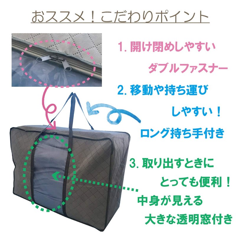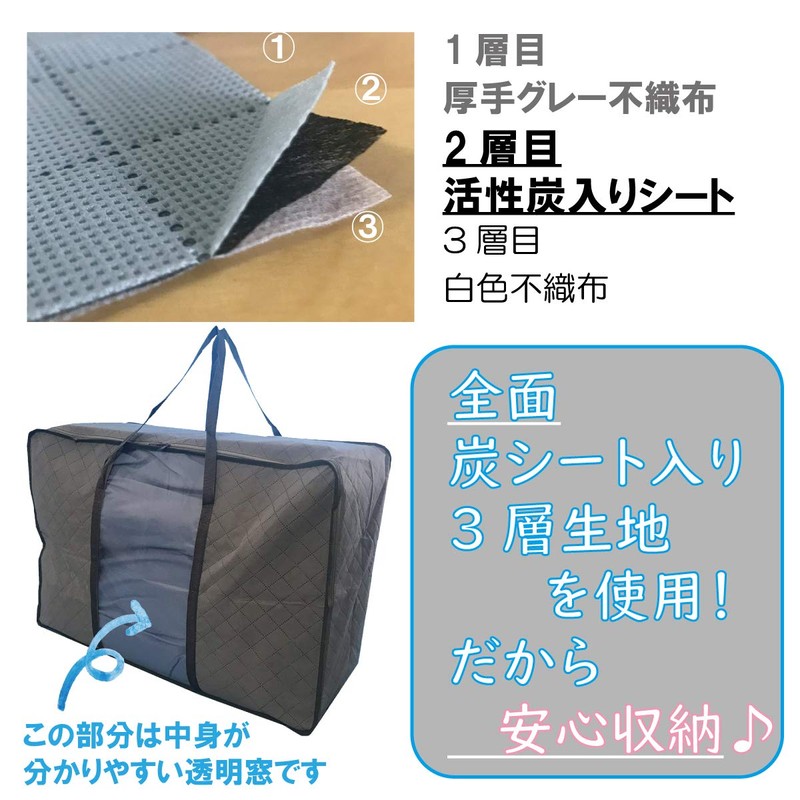 - Neatly stores bulky duvets. This is a great value set of 2. Breathable thick non-woven fabric with activated carbon sheet. The front of the storage bag is made with 3 layers of fabric (some clear windows) with activated carbon sheet, so you can store it for the next season. Wide zipper for easy access and easy access and long handle for carrying and organization