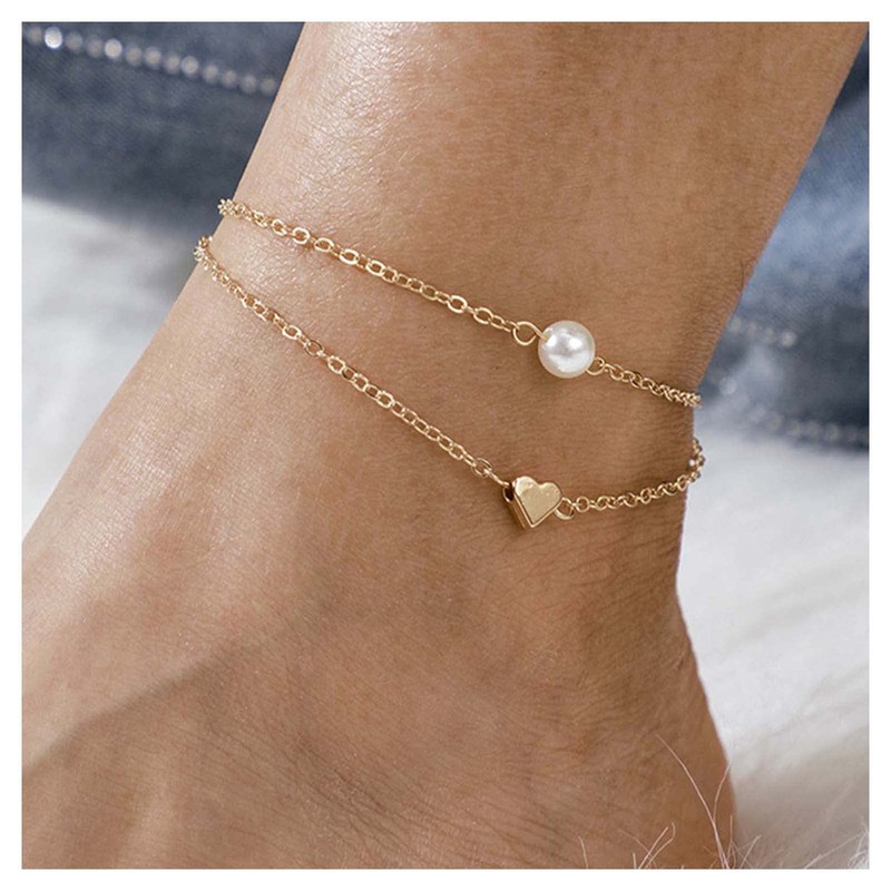 Inilbran Boho Heart Ankle Bracelet Gold Layered Pearl Anklet Bracelet Love Heart Chain Anklet White Pearl Heart Anklet Anklet Jewellery for Women and Girls, Metal