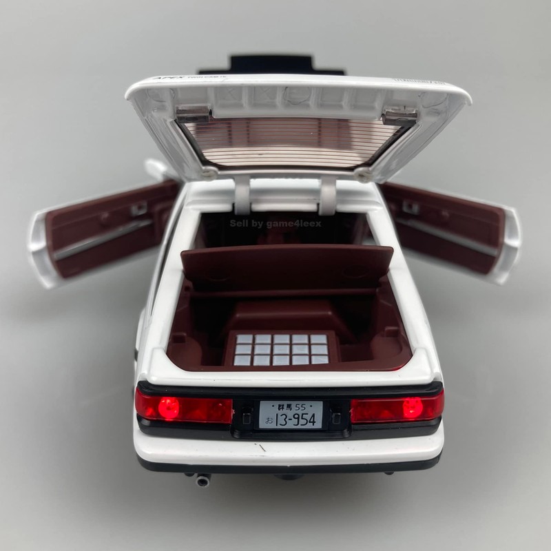 You are watching very nice made 1:28 Scale Diecast of Trueno AE86 - Comics Initial D main charaster Fujiwara Takumi's drift car. When push down the car, there will be engine voice and drifting sound, together with the headlights and backlights flashing. The doors, front and back hoods are openable. It's brand new in box, and come with a display base. Push down the car there is engine sound and the pop-up headlights will be light, 2 * LR44 batteries required.