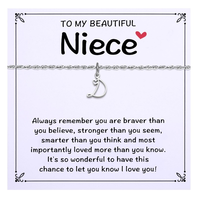 - Niece Gifts from Aunt Uncle -- Show your niece how much you care with this beautiful initial necklace. Each necklace comes with an inspirational message card to remind her of her inner strength, courage, intelligence and the immense love she has in her life. Each initial has a unique meaning, representing a first name, a last name, a special story, an important person or any other meaningful connection.