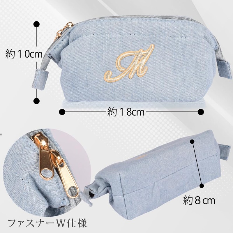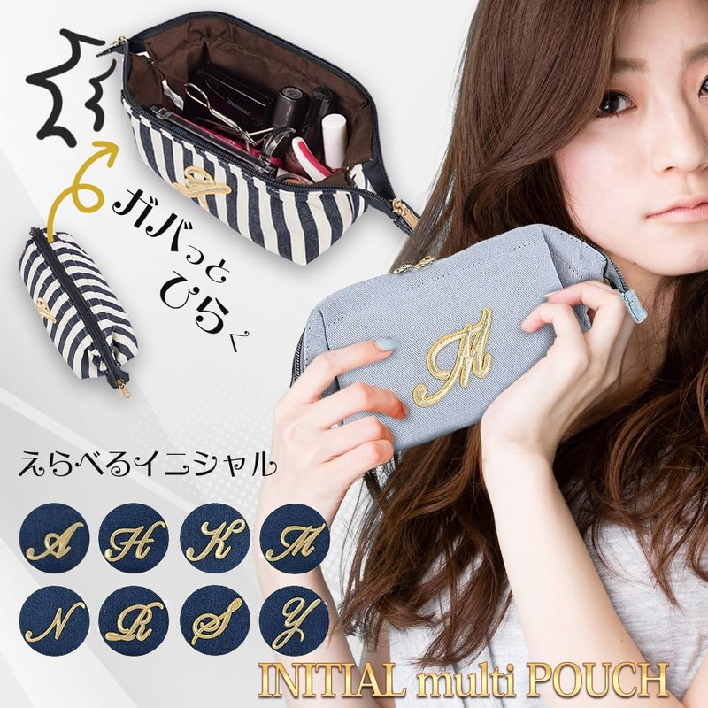 - An initial pouch with a gorgeous initial patch attached to a casual cotton fabric. Choose from Indigo Light Blue Stripes to choose from "A", "H", "K", "M", "N", "R", "S", "Y"