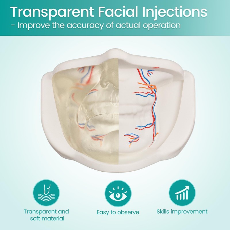 - ✅Transparent Facial Model Made of Transparency Material: Made from high-transparency TPE material, the model's face offers excellent clarity, allowing clear visualization of blood vessels and injection paths. This enhances the realism and operability of the training, with excellent rebound resilience and durability.