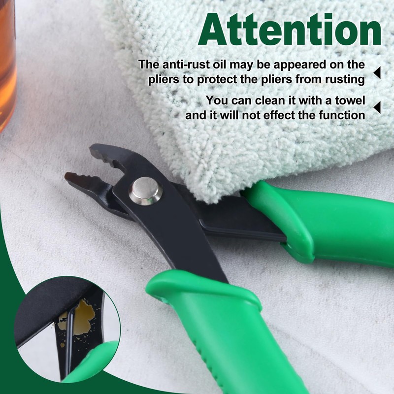 - Tipps: Es kann Anti-Rost-Öl auf der Zange sein, das die Zange vor Rost schützt, reinigen Sie sie vor dem Gebrauch mit einem Handtuch und bewahren Sie sie dann in einer trockenen Umgebung auf, ohne die Funktionen zu beeinträchtigen.