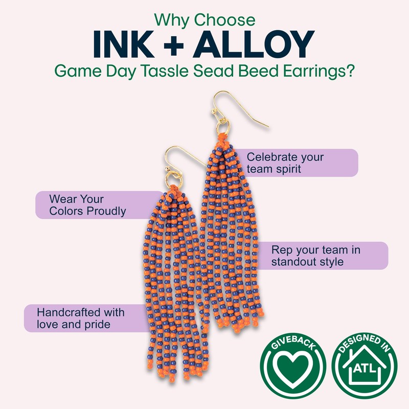 INK + ALLOY Game Day Tassel Seed Bead Earrings – Handcrafted Statement Earrings ready for Gameday! – Lightweight & Bold (Navy + Orange)