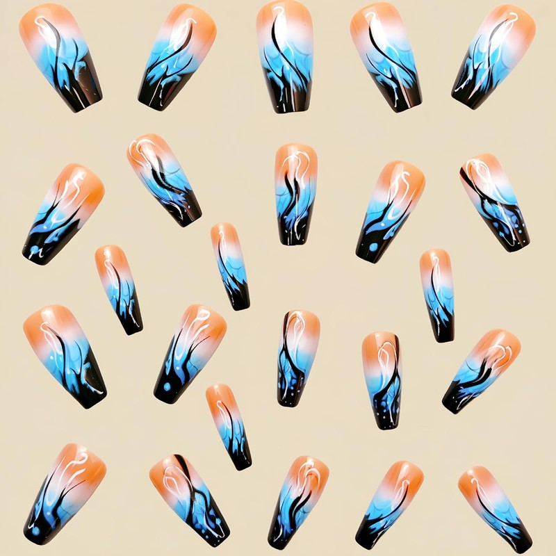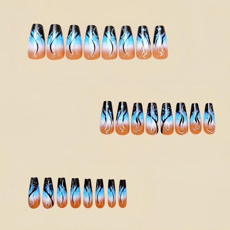Ink Blue Ombre Press on Nails Medium Square QUNQINLI Coffin Fake Nails Nude False Nails Press ons with Blue Flames Design Nail Art Tips Full Cover Artificial Glue on Nails for Women 24 Pcs
