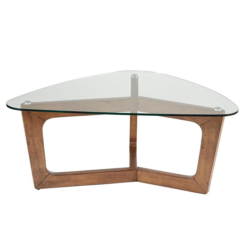 - Design - Triangle accent table with tempered glass table top on solid wood frame in pecan finish. A harmonious blend of wood and glass not only adds a touch of refinement to your living space but also ensures durability and easy maintenance