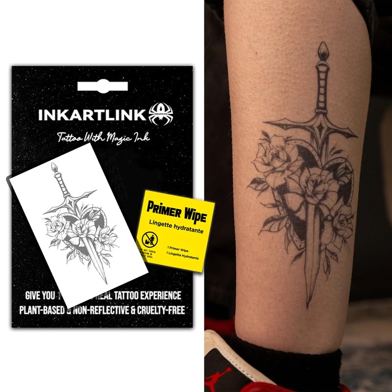 INKARTLINK Semi Permanent Tattoo, Temporary Tattoo, party tattoo, beautiful and realistic design, fun tattoo experience, cruelty-free, non-reflective, waterproof (Rose Cross Sword)