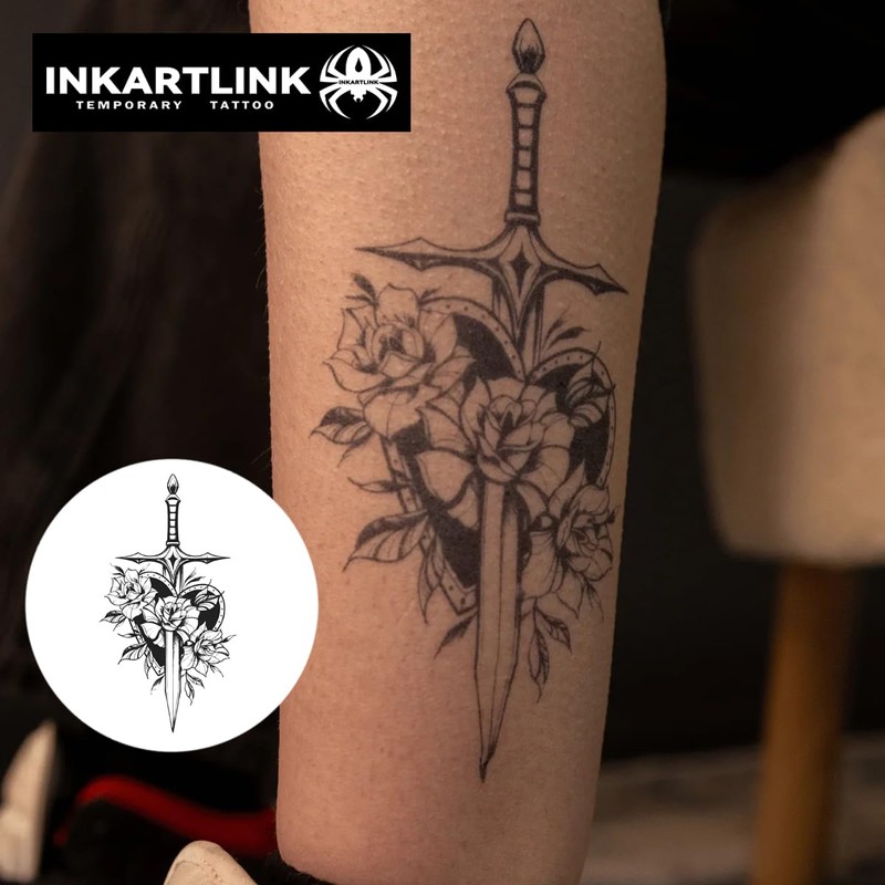 INKARTLINK Semi Permanent Tattoo, Temporary Tattoo, party tattoo, beautiful and realistic design, fun tattoo experience, cruelty-free, non-reflective, waterproof (Rose Cross Sword)