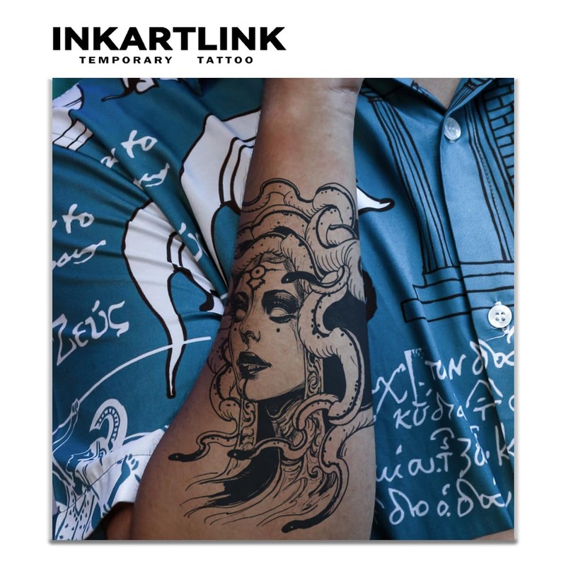 INKARTLINK Tattoo Tech, 2 Sheets Large Semi Permanent Tattoo, Adult Art Design Temporary Tattoos, Lasts 1-2 Weeks, Waterproof, Realistic Look, No Adhesive, No Reflection (Realistic Medusa Design)