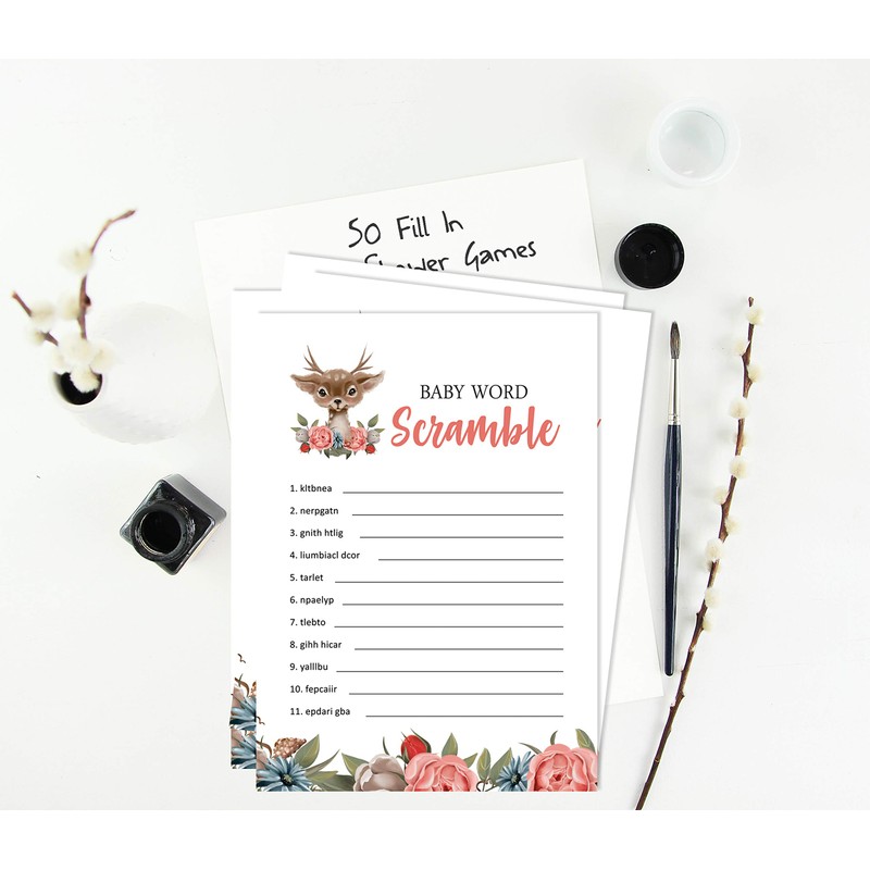 Inkdotpot 50 Pack Baby Word Scramble Baby Shower Game Cards Deer Jungle Animals Party Supplies Fun Baby Shower Game Favors