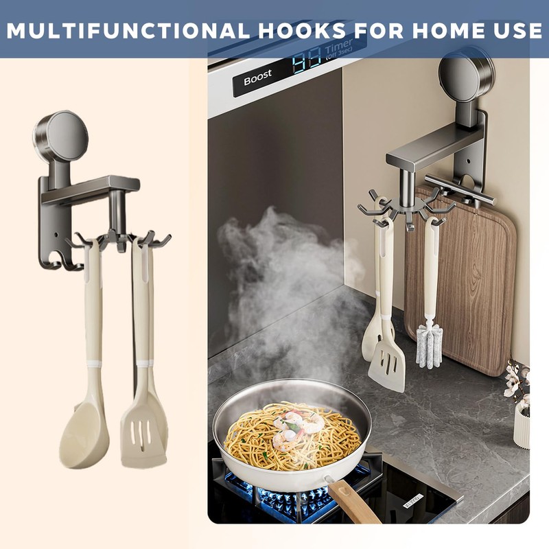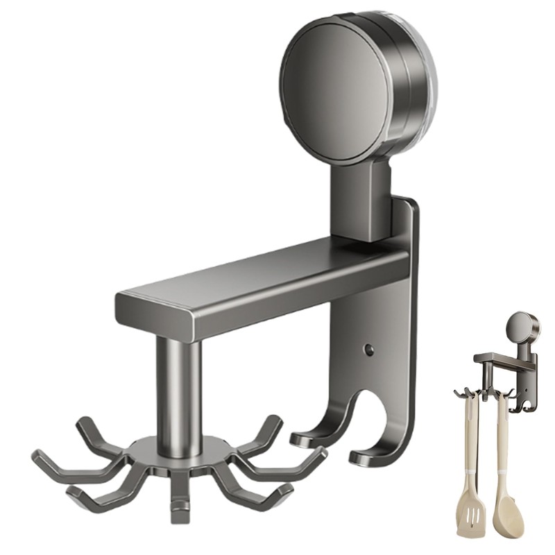 - Rotating hook: The freely rotating 360 degree design helps distinguish and hold more items. The Gunmetal Grey Swivel Hook is perfect for your kitchen. With 10 hooks, it offers plenty of space to organize your kitchenware. The suction cup hooks can be quickly and easily attached to the wall.