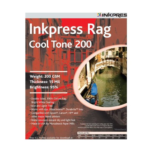 Rag Cool Tone - 200gsm, 15 mil, 95% Bright, Double Sided 100 % cotton rag archival media for Giclee inkjet printing. 100 % acid and lignin free. Bright White coating provides excellent color and b&w reproductions. Light and water resistant coating allows enhancing, spotting, or airbrushing work. Smooth texture watercolor paper. Ideal for ultrachrome, dye and pigmented inks. Instant dry and light fast. Compatible with Epson, Canon, HP, and other major brand printers.