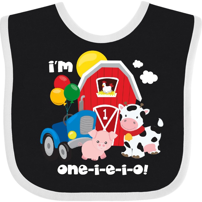 inktastic ONE-I-E-I-O 1st Birthday Baby Bib Black and White 34a09