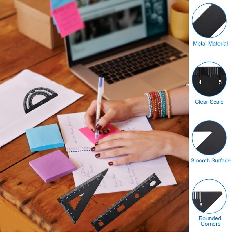 Inkurie 8 Pcs Geometry Set, Aluminum Alloy Metal Drafting Ruler Set Black Mat...