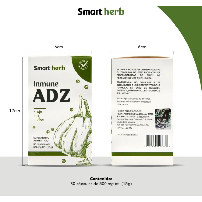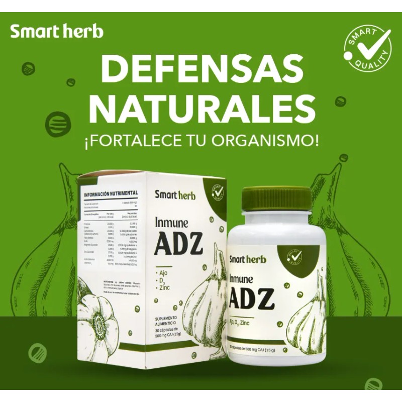 Inmune ADZ, Pack 2 Piezas (30 Cpsulas cu), Suplemento Alimenticio con Ajo, Vitamina D3 y Zinc para Fortalecer el Sistema Inmunolgico, SMART HERB
