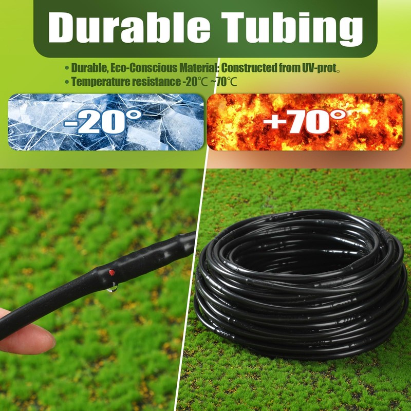 - Durable and Long Lasting Material: crafted from uv resistant polyethylene, our irrigation drip line emitter tubing offers durability, resisting cracking, heat, and chemicals; Safe for edible plants, it is suitable for prolonged outdoor apply