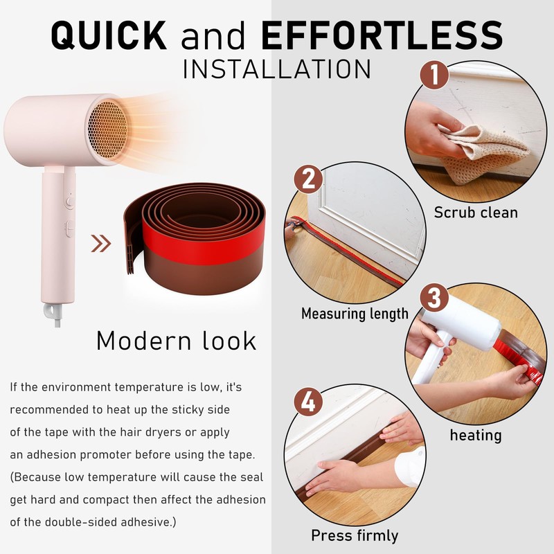 - Easy Installation, Fast and Convenient: it is easy to install our door draft strips; First, clean the door surface, peel off the adhesive strip on the back, and then stick the door draft strip directly at the appropriate height; If there is any excess, it can be easily trimmed; No professional tools and skills are required, anyone can easily get started, saving time and energy