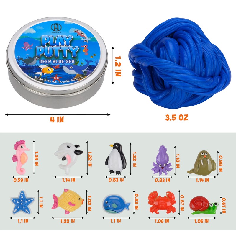 - INCLUDED – Contains 3.5oz silicone therapy putty and a set of 10 beautifully hand painted charms (seahorse, octopus, dolphin, fish, whale, penguin, starfish, walrus, crab, and a snail) in a 4" metal tin that can withstand years of use