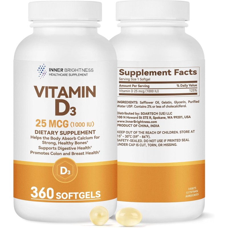 Inner Brightness Vitamin D3 1000 IU (25 mcg) Softgels, Bone, Immune & Digestive Health Support, Gluten Free, No Artificial Additives, 360 Count, 360 Day Supply